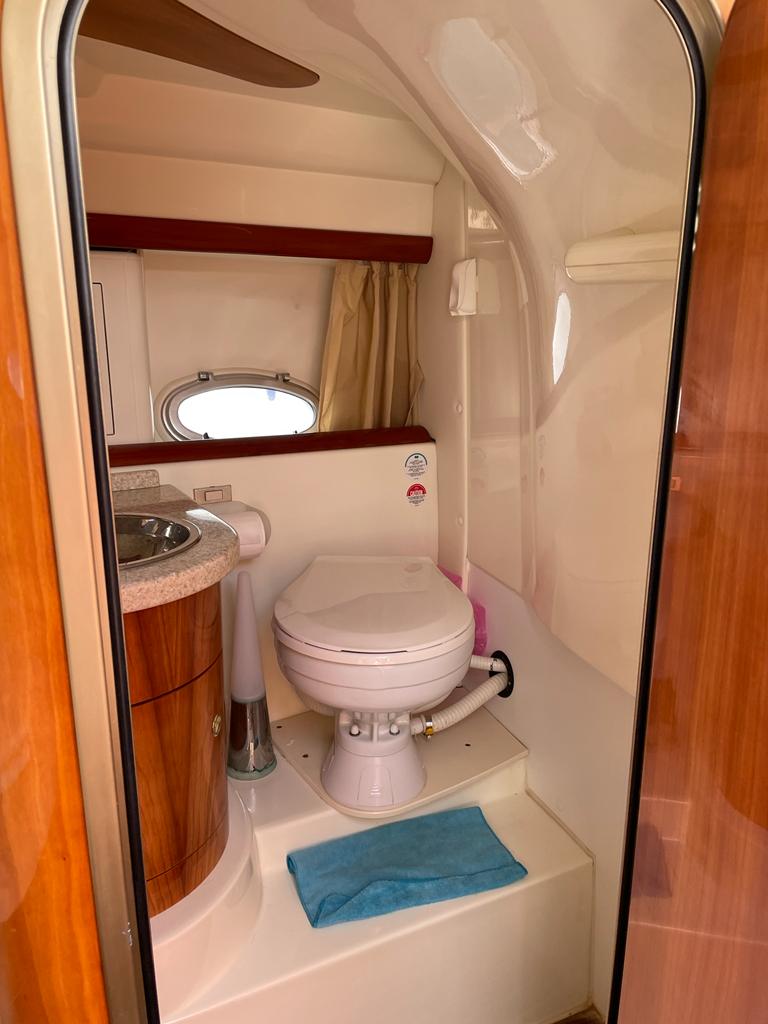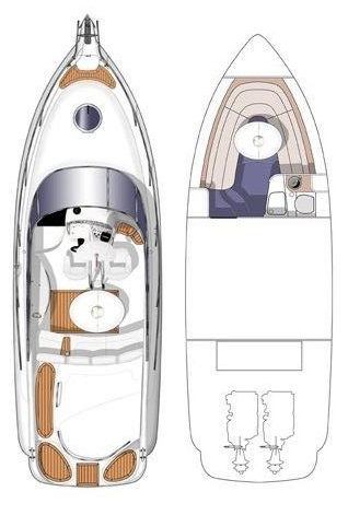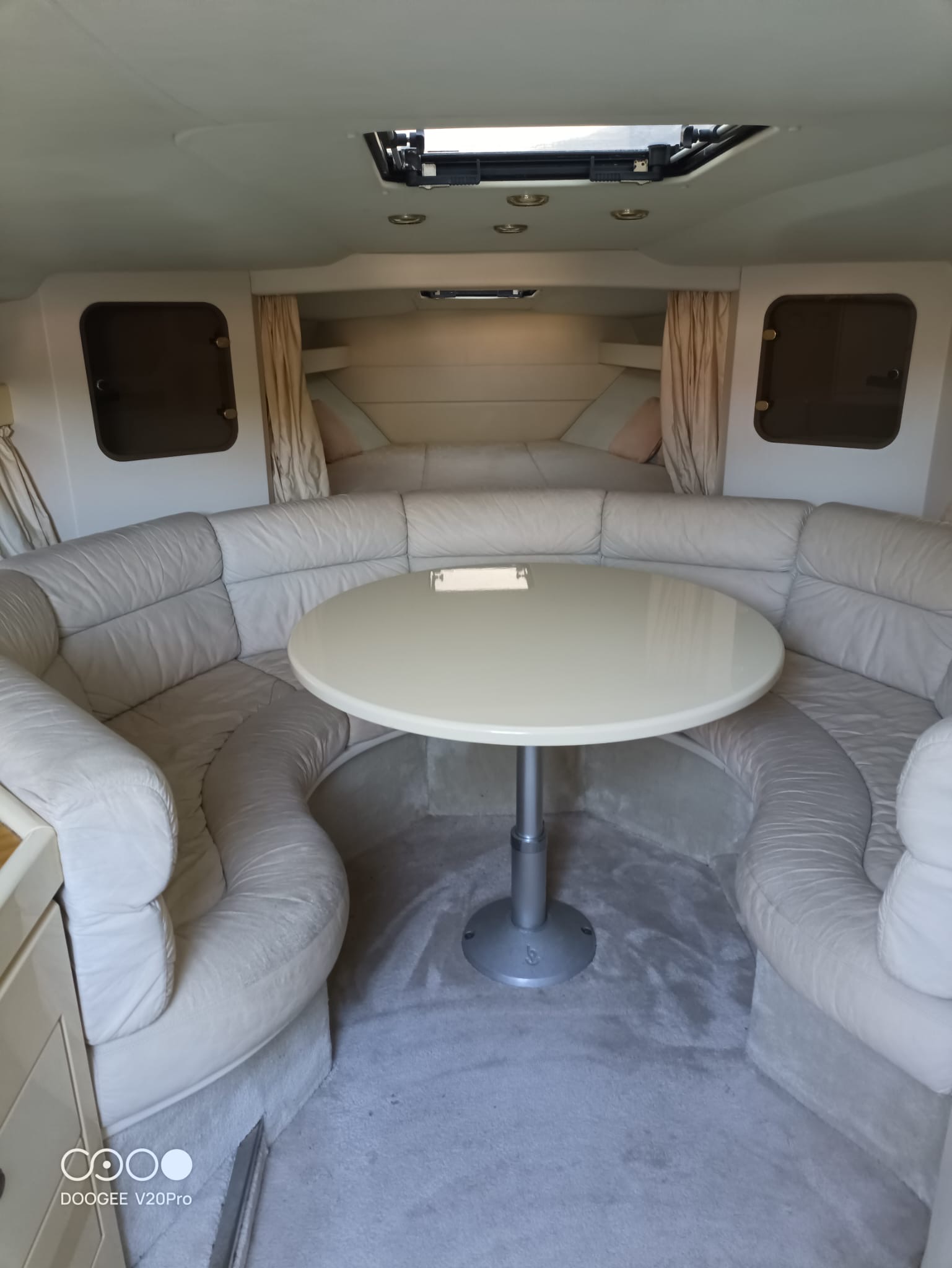 Ampia cuccetta a prua, angolo snack con frigo e toilette separata . Esternamente grande prendisole e zona con sedute e sedili guida , lavandino e wetbar, doccia di poppa.