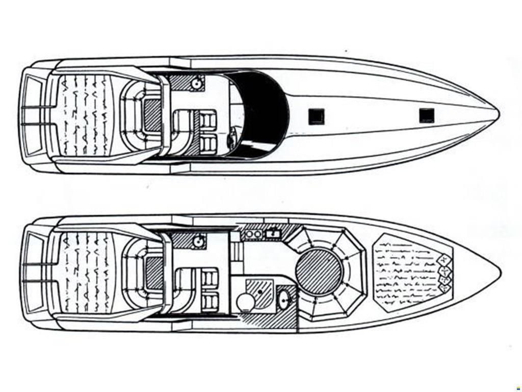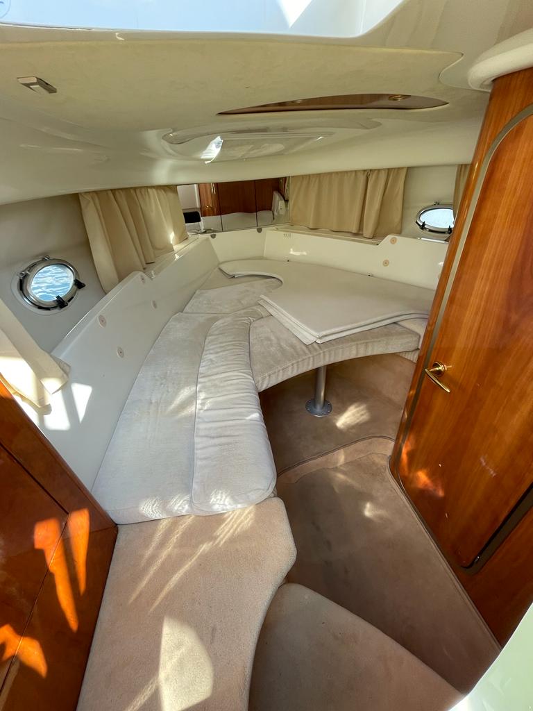 Ampia cuccetta a prua, angolo snack con frigo e toilette separata . Esternamente grande prendisole e zona con sedute e sedili guida , lavandino e wetbar, doccia di poppa.