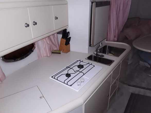 4 Posti letto, dinette trasformabile a prua e cabina a centro barca. Cucina in salone dinette con frigo , lavandino , piastra elettrica.