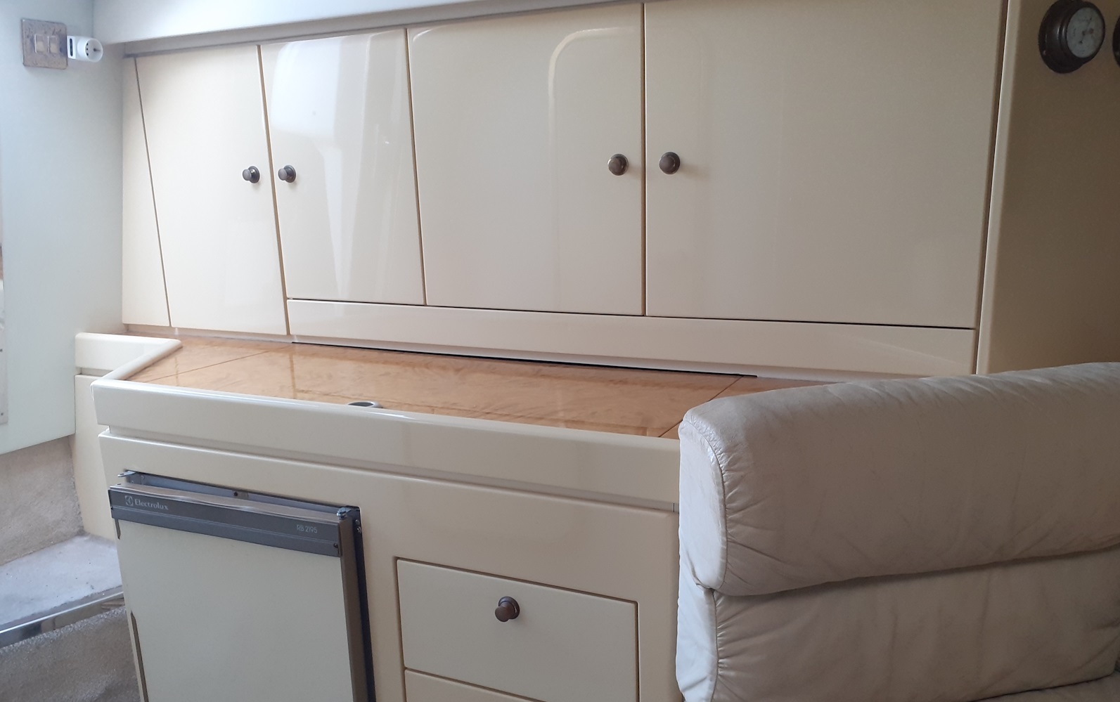Salone living , cuscinerie in pelle (nuove) e pareti in alcantara, cucina di bordo dotata di frigo con congelatore (nuovo) , microonde, piastra vetroceramica a 2 fuochi. Aria condizionata reversibile (freddo/caldo) in tutti gli ambienti , generatore di corrente Paguro 4 kw, dotazioni di sicurezza .